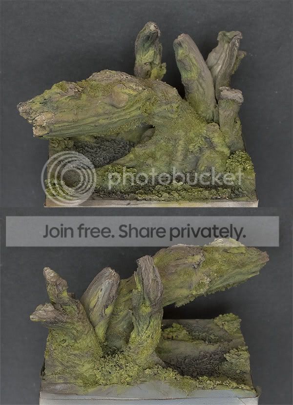 Myślę jednak, że może dałoby radę jeszcze wzbogacić "dno" (bo nie wiem, czy to już dno, czy tylko ograniczenie podstawki ) i dodać kilka roślinek, gałązek itp. "śmieci", które po zalaniu wodą lekko by nad jej powierzchnię wystawały. Tak mi się pomyślało.
