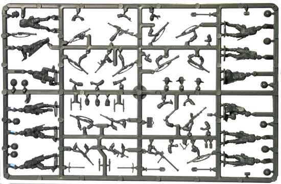 Desert Rats 1940-43. 38 hard plastic multipose British or Commonwealth infantry for the desert war. There are enough to make a platoon of 3 sections plus an HQ section. Also included are 32x 20mm circular and 4x 40mm square bases (for the support teams).