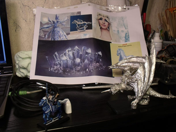 oj tam brzydka od razu.. jutro postaram się wrzucić jakieś foty z warsztatu bo robi się coraz ładniejsza, ma już lodowo śniegową podstawkę, zmieniłem jej kolor kiecki (na turkus który odcina się od konia), koń jest już bardziej kryształowy, trochę detali przybyło. Cudu z tego nie będzie ale za to bardzo miła dla oka panienka. Szukam cały czas jakiejś inspiracji na jej kieckę, generalnie już chyba zagospodarowałem wszystkie powierzchnie prócz kiecki... może jakieś takie oszronione jak są szyby, albo jakiś inny zimowy motyw, albo po prostu jakieś esy floresy ;) W każdym bądź razie jak freehandy to już bez umiaru. Przy okazji poćwiczę sobie kryształki, które już od dawien dawna chodziły mi po głowie tylko nie miałem ich na czym realizować a królewna śnieżka jest perfekt, mimo tego, że ciut sztywna laska.