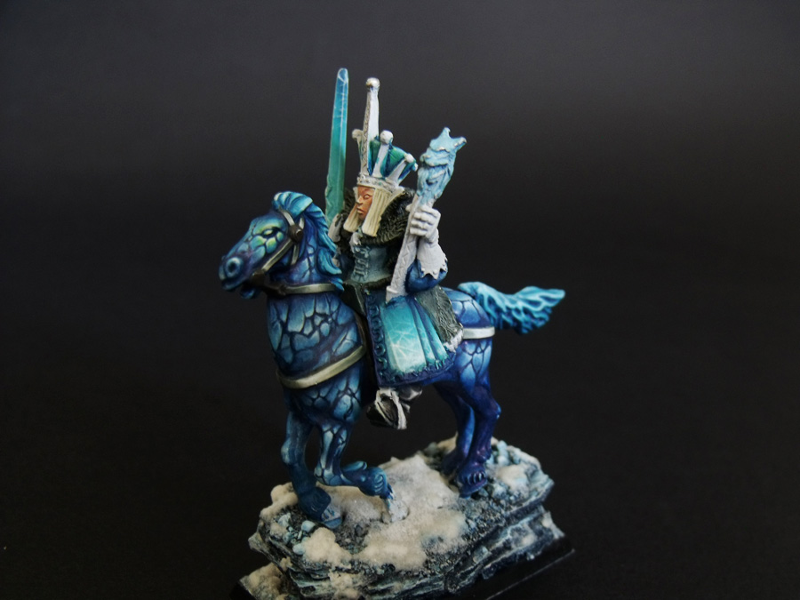 2. Miecz - moim zdaniem uciekasz w turkus i zieleń za bardzo i możesz stracić efekt lodu, a zyskać morski. Posiłkujesz się malowaniem Ani, ale Ania malowała w morskim klimacie modele (muszle, woda itp.), a Ty robisz lód i ten kolor mi już tutaj nie pasuje. Nie wygląda źle, ale jednak w odbiorze całości ucieka mi z tematem... Kiecka jest jeszcze OK. Przy lodowym malowaniu potrzeba Ci chłodu i błękitu, zieleni jak najmniej...