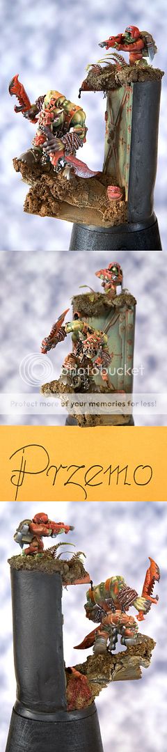 Rentall - co rozumiesz przez "ciezka figurke"? Malo czytelna tak? Czaszki nie mialy byc metalowe, moze rzeczywiscie przesadzilem z blikami. A co do ziemi to na dole jest duzy kawalek kory. Na to narzucona tu i owdzie mieszanka wikolu z piaskiem, dajaca efekt ziemi. A pod grotem rowniez wikol + piasek. Nic wiecej. Jeszcze miejscami potem przykleilem sam piasek nadajac innej faktury.