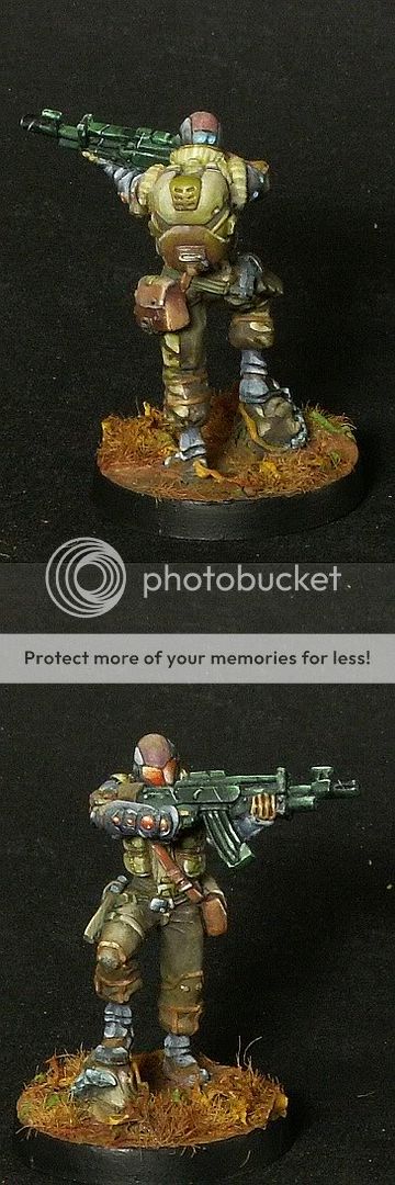 Bardzo efektowne, militarno-futurystyczne malowanie. Praktycznie model jako jeden z lepszych w Twoim wykonaniu. Podoba mi się ziemista podstawka, dobrze pasuje odcieniami i wykonaniem do klimatu figurki. Jedynie buty bym przemalował na ciemny brąz lub czerń, szare mi nie pasują, za to w broni magazynek na pewno bym zrobił metalowy, ew. grafitowy