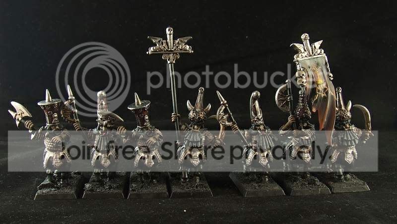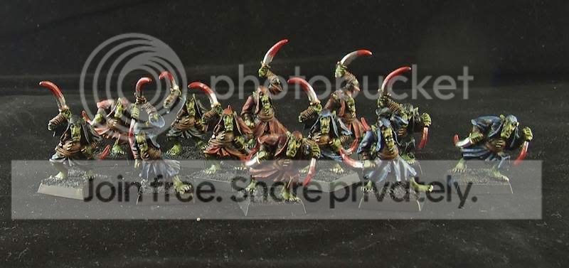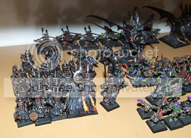 Z reguły na malowanie armii mam plus-minus 2 miesiące, tym razem też tak miało być, ale w trakcie się okazało, żebym się nie spieszył i bardziej się postarał... No to zwolniłem... Później znów przyspieszyłem, bo się ciągnęło i wypadałoby kończyć, bo następne (Skaveny) czekają, a międzyczasie było trochę dodatkowych robótek, zmian koncepcji i nowych pomysłów klienta, dodatków i mnie to wszystko z rytmu troszkę wybijało... No i wyszło 3 miesiące z małym haczykiem. Na fotki nie zawsze mam czas, bo jak się termin przeciąga z jakiegoś tam powodu, to bywa tak, że w ostatni dzień psikam lakierem i po niedługim czasie przyjeżdża klient, płaci i zabiera zabawki