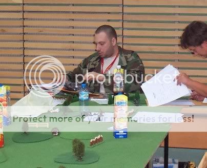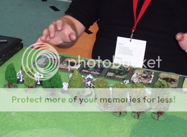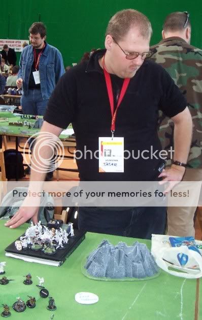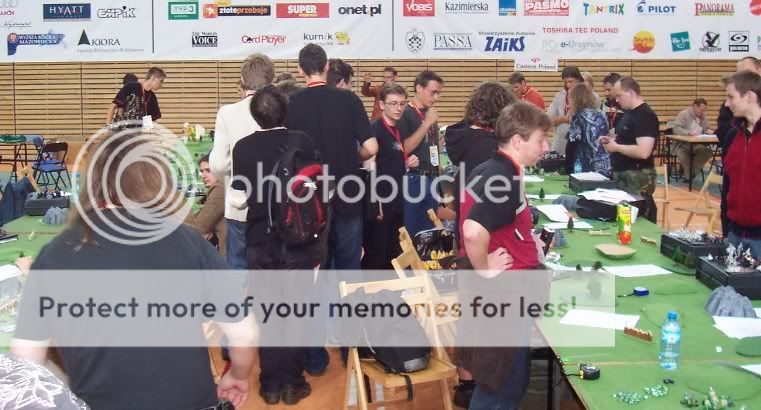 Pozytywnie zaskoczył mnie również wygląd stołów ,na których przyszło nam rozgrywać "mistrzowskie" bitwy. Każdy stół wyglądał niemal identycznie i w jego skład wchodziła zazwyczaj jedna, większa - kamienna góra, kilka wzgórz, 1-3 płotków oraz 1-3 lasów(jako templejty z dwoma drzewkami, aby było wiadomo o co chodzi). Ich wygląd był bardzo schludny i miły dla oka. Nie uświadczyłem tak często spotykanych szpetot w stylu pomalowanego na zielono styropianu udającego górkę, czy masy ni to płotków- ni to domków z odpadającymi kawałkami szpachlówki. Pole każdej pary wyglądało niemal tak samo , przez co całość wyglądała jednolicie i nikt nie miał przewagi terenowej nad innym stołem. Wielki plus.