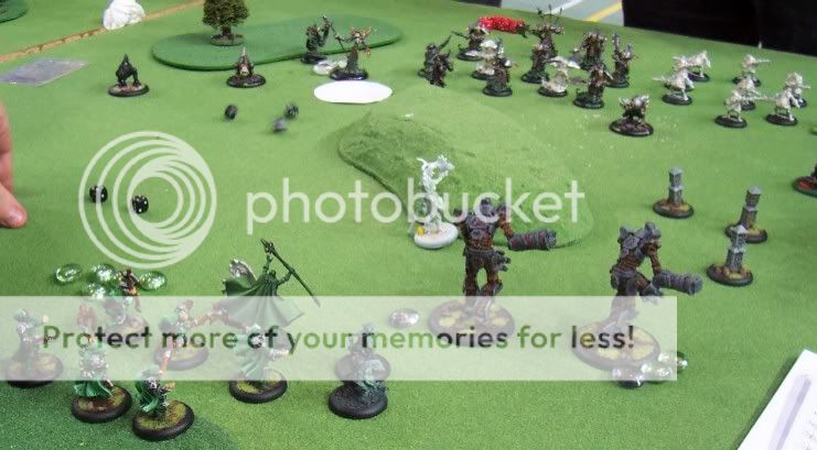 Trzecie grupa?ojj, tu zaczynało się robić naprawdę niesmacznie. Nie przygotowani na tak mocny powergaming, przyjechaliśmy z naszymi dość standardowymi ropiskami i byliśmy tym faktem dość niemile zaskoczeni. Ja osobiście (a zresztą ? także i masa innych graczy), byłem wściekły na samograje Orborosu (zdjęcie poniżej), z którymi np. Cryx na Covenie (to ja!) miał naprawdę marne szanse wygrać. Cóż?3 razy pod rząd trafiłem na to samo, druidzkie gówienko i 3 razy siedziałem jak wryty, nie mogąc nawet kiwnąć palcem na dziejącą się na stole masakrę. Ok., mój błąd ? nie miałem drugiej rozpy (brak figurasów). Dwa mecze udało mi się wygrać ? reszta należała do Obory. Mój brak szczęścia sięgnął zenitu?