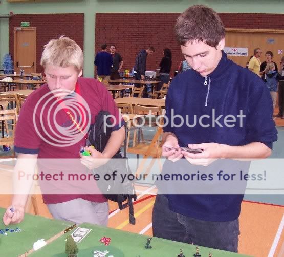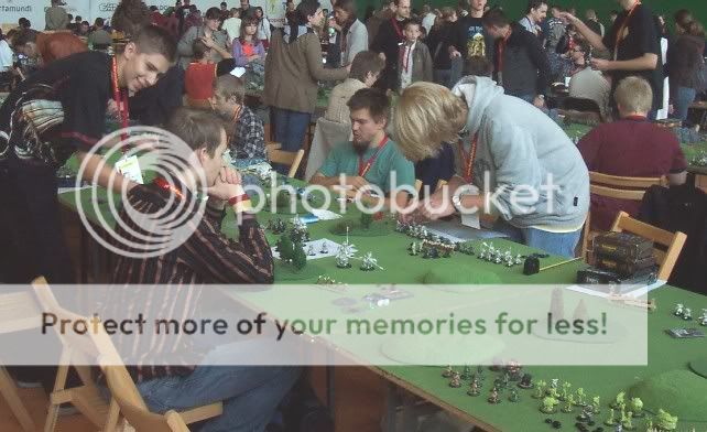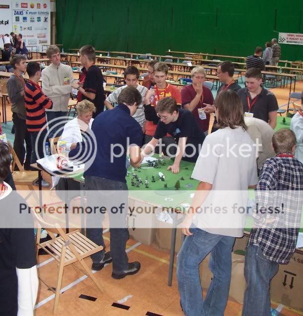 Dość statystyk. Rozpoczynamy pierwszą bitwę! I tu pojawiło się kilka drobnych, acz irytujących problemów. Po pierwsze ? na sali nie zauważyłem obecności ANI JEDNEGO sędziego. Tak, była to sprawa dość podejrzana. Od razu sprostuję, jeśli ktoś ma wątpliwości ? nie można powiedzieć, że nie dało się grać. Gracze pomagali sobie wzajemnie i wszelkie niesnaski można było rozwiązać naprawdę pokojowo. Aczkolwiek czasami brakowało mi kogoś, kto podszedłby do stolika i powiedział jasno na czym polega dany scenariusz i rozstrzygnął ewentualne spory. Tu zaś pojawia się drugi zonk ? często nie wiadomo było na czym tak naprawdę gramy. Informacje rozchodziły się, co prawda, szybko ? ale i chaotycznie. Na całą salę mieliśmy tylko jedną kopię z rozpisanymi scenariuszami Steamroller?a. Kolejny problem ? druga bitwa nie figurowała w zasadach Steamroller?a 3.0! Dodatkowo, mniej więcej po drugiej rundzie okazało się, że nie liczymy VP! Cóż, policzyłem do ostatniej potyczki, a o wyżej wymienionej nowince dowiedziałem się dopiero w domu. Ale i tak tego typu bolączki niemal w ogóle nie wadziły grze. Najgorsza była natomiast nieprzewidywalna ilość rund. Tak naprawdę nikt do końca nie wiedział ile tur jeszcze rozegramy, przez co kilka osób musiało wcześniej lecieć. Ostatecznie bitew było 5 + 1 gra Simona z Xellosem o tytuł mistrza Polski. O tym za chwilkę.