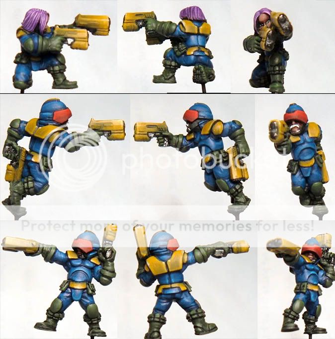 cartoony colours but they looks very good for only 5 hours of painting. I like the blending on the guns the most. But I don't like that white moustache on the second one. Looks too much like an unpainted part to me I'm afraid.