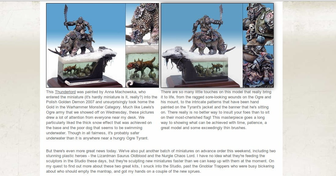 Probably most of you know that the latest releases from Games Workshop were new Ogre Kingdoms miniatures. Games Workshop showcased some interesting Ogre Kingdoms miniatures on their website, including Golden Demon winning Ogre Thunderlord on Rhinox painted by Ańa.
