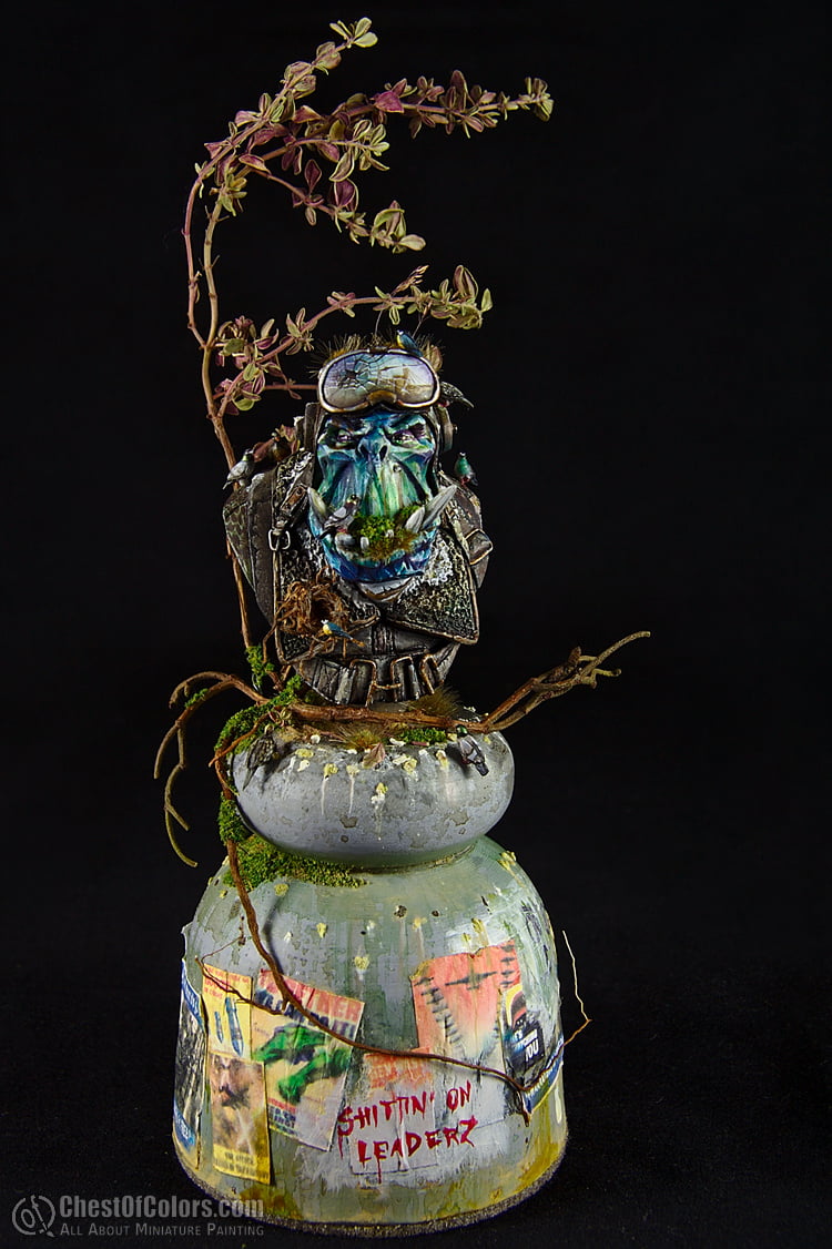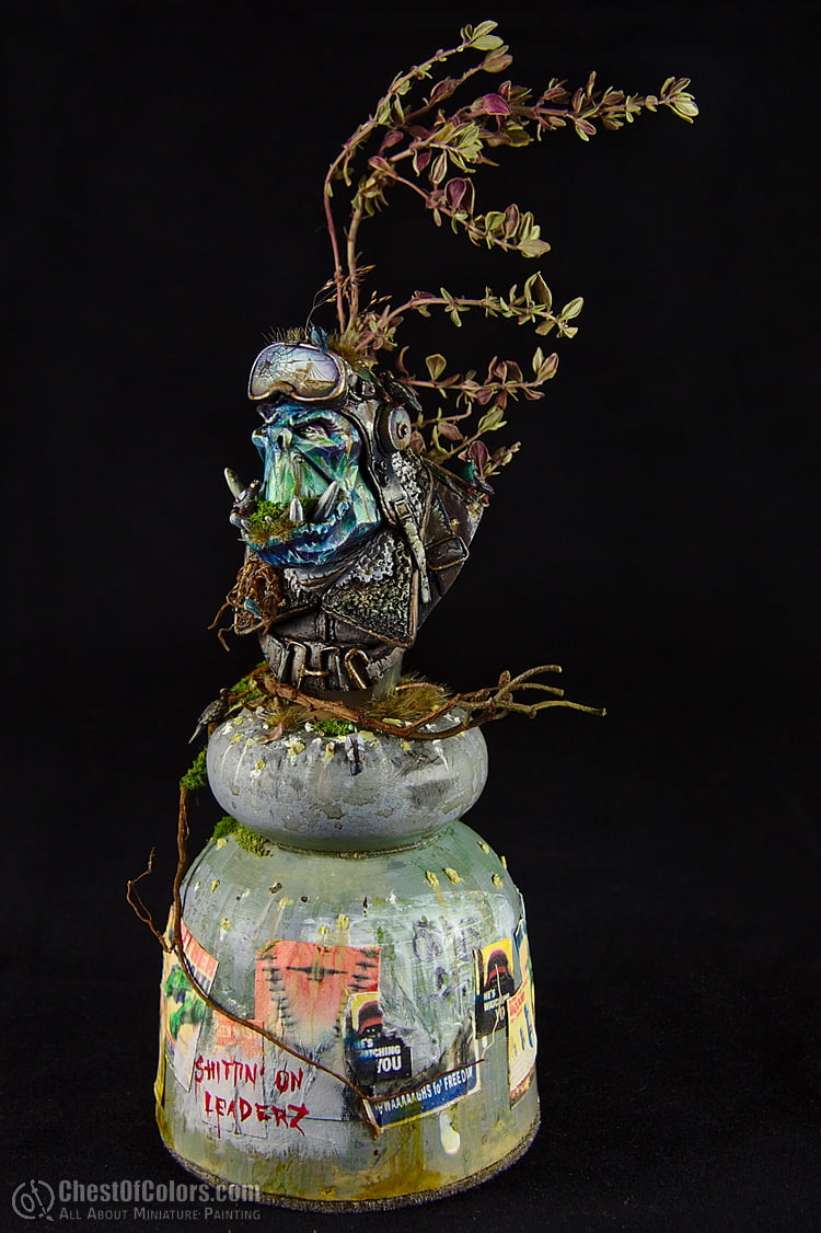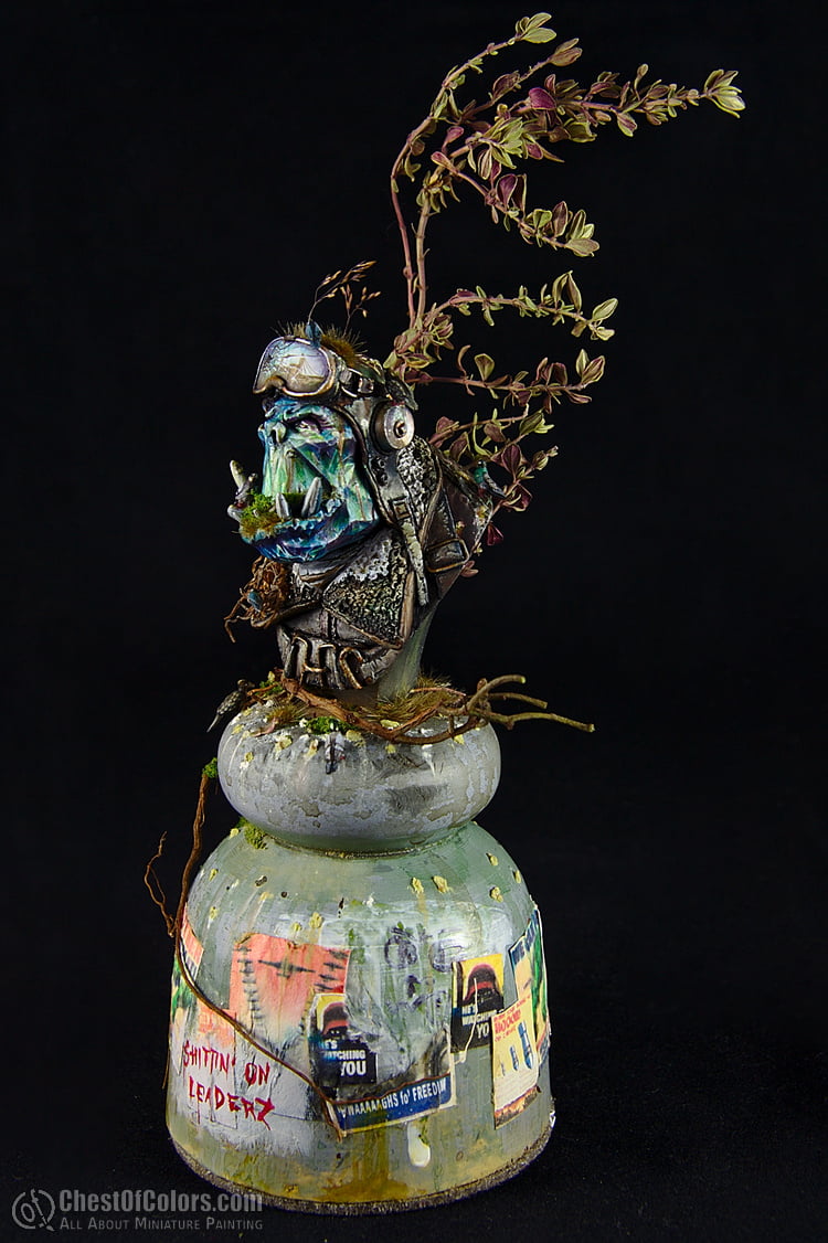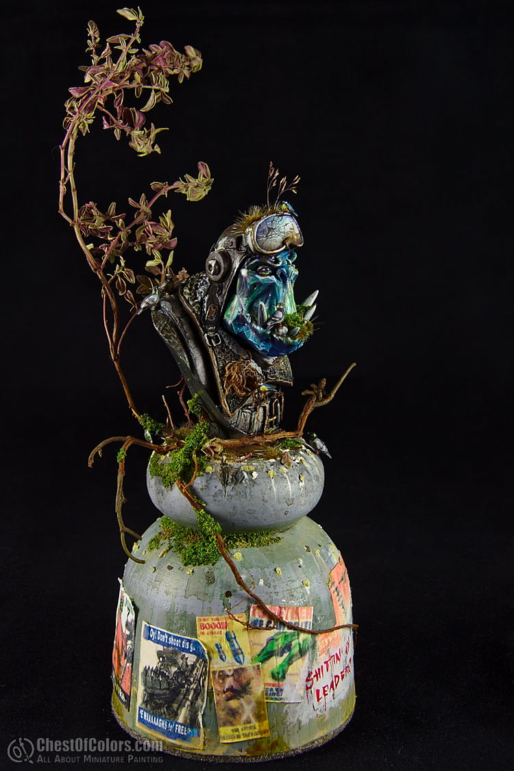 Instead of painting him as an actual orc, I decided to make him a statue, a monument to a nameless orc pilot (or: the “collective” pilot). Orcs do honor their heroes in their own specific way, don’t they? 😉 But instead of making it bronze or stone, I went for a more crystal-like look, plus more realistic equipment. Just as if the statue was partially made from actual items or… trash. 😀