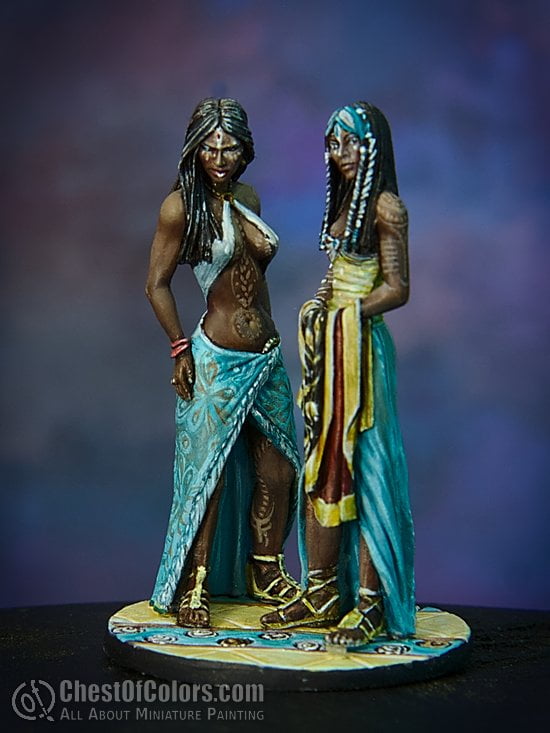 I had only rough guidelines to follow when painting these models, regarding their skintones and the kind of fabric for their clothes. The decorations on their skins were my addition, just to make them a bit more interesting.