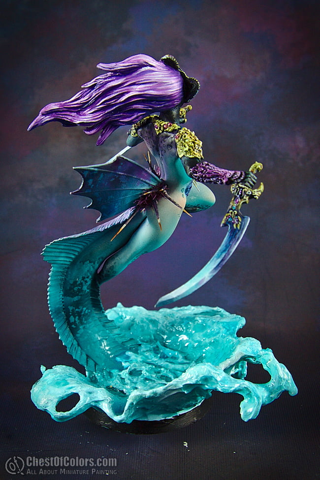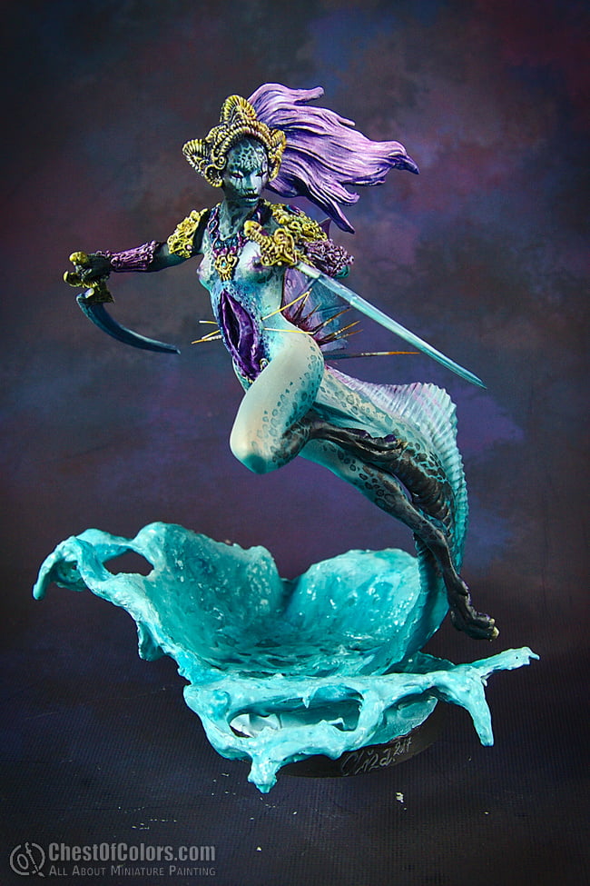 I won’t be writing too much about the model, as you can easily find it in the Pegaso Models range, and my concept was to paint her much like a larger version of the daemonettes I painted a few months ago. My color scheme for them was not quite like the official one, and this one is a slightly modified copy of the same scheme.