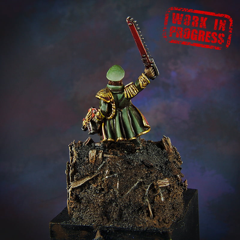 It’s still a work-in-progress photo, but I won’t be spending too much time with this model as well. I have a collection of older Imperial Guard models that I want to have painted, so I will have to sacrifice some quality in order to get them painted at all. Will be cleaning-up a bit here and there and need to tweak the base quite a bit for sure.