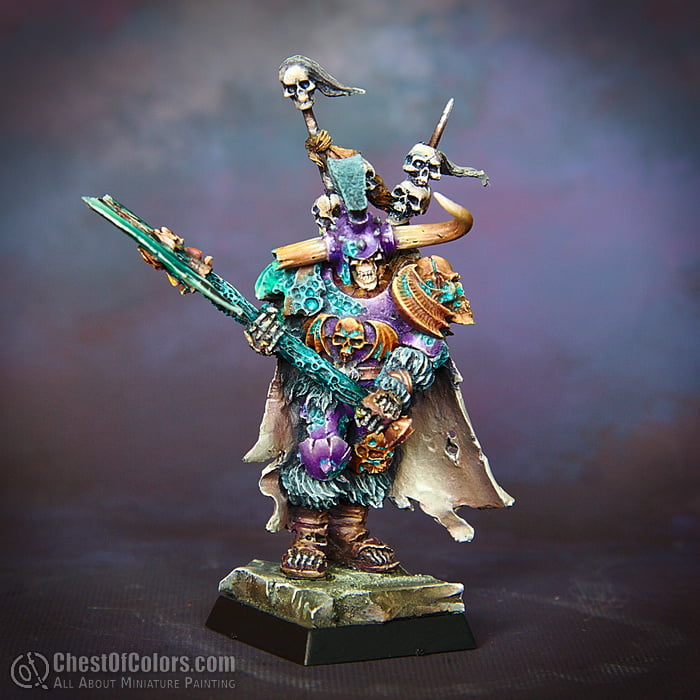 The general request was to take the Archaon model and turn it into a lord of Tzeentch, with a big cloak and huge banner, all decorated with freehand paintings. I think it was the last model I did in this theme, and in result of my escape from blue Tzeentch models I turned towards the Slaaneshi ones that I am still painting…