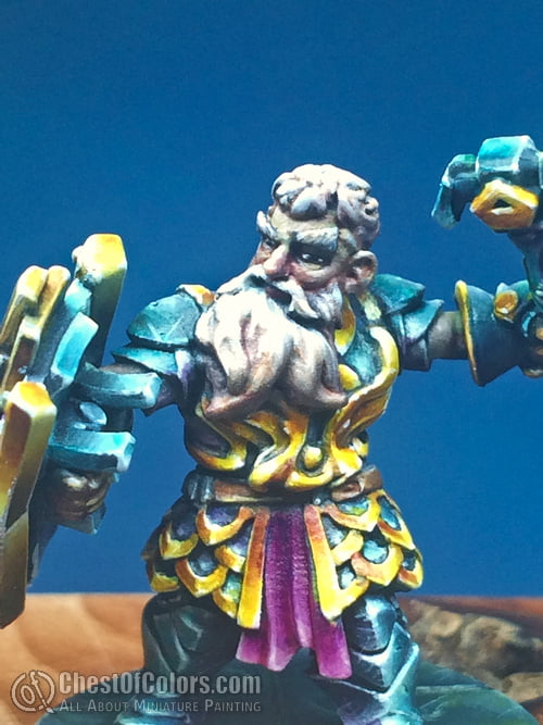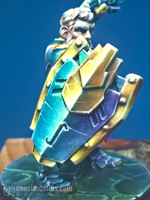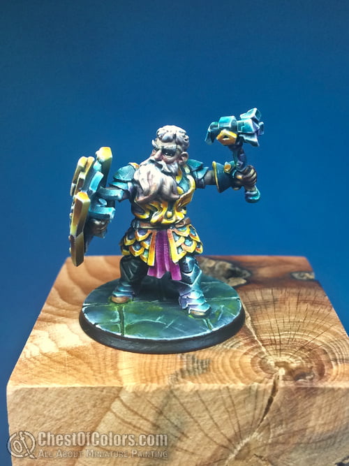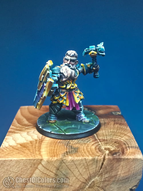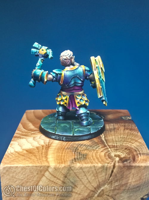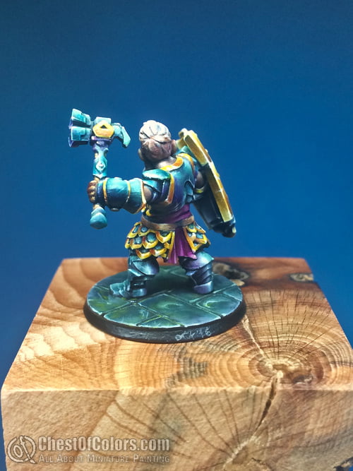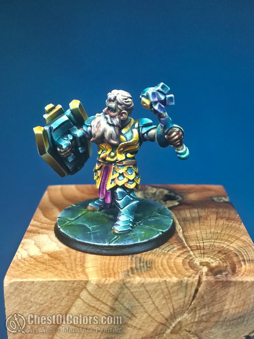 This is the first miniature from Hero Forge that I had opportunity to paint. The figure was made from material called ‘Beta grey plastic’. There were no mould lines, as the mini was 3D printed, but there was a lot of tiny ‘pegs’ – remains of printing process that had to be removed. It was cast as one piece miniature, together with the square base. After priming the mini looked just like “normal” figure. The detail level is sufficient for gaming miniature.