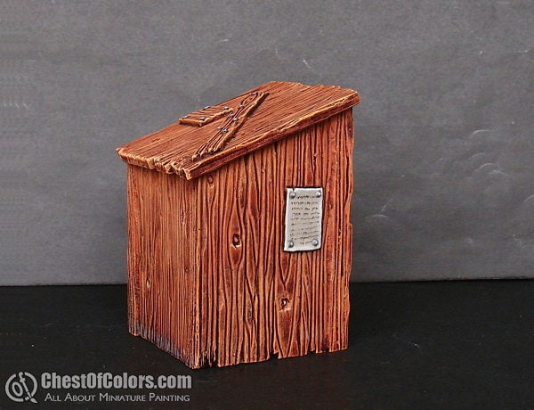Here is the first batch of painted stuff from minimonsters.eu. These are small and big barrels accompanied by outhouse. A lot of wood with steel elements. As for the wood color I airbrushed elements with flesh tone and when it dried I applied dark brown wash followed by drybrush of light flesh color. Then I emphasized highlights with precise brush. When necessary I applied wood grain texture with thin dark lines, like on small barrels that had no sculpted wood texture.