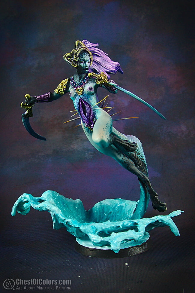 I won’t be writing too much about the model, as you can easily find it in the Pegaso Models range, and my concept was to paint her much like a larger version of the daemonettes I painted a few months ago. My color scheme for them was not quite like the official one, and this one is a slightly modified copy of the same scheme.