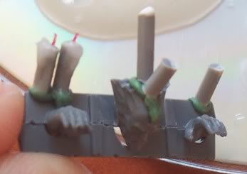 I hope everyone knows how to sculpt spikes but for the more hesitant sculptors here is how I do them. Do one little ball of green stuff and put it on a flat surface, then dip fingers on water and start pressing green stuff against surface with vertical movements, just let it dry. Piece of cake.
