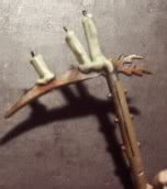 Now it’s time for the legs. Take a scything talon and cut it apart as in the picture. Make the end of it round and make sure that it fits the holes in the main body.