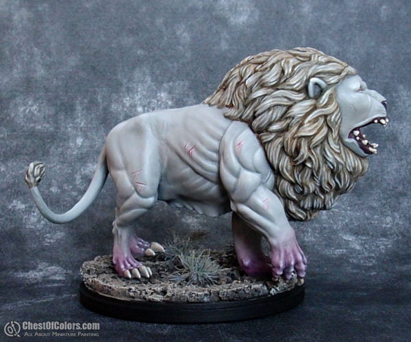 Here is my version of plastic White Lion from Kingdom Death: Monster tabletop game. To change overall greyish color I painted his eyes in bright red and added bleeding wounds. I also applied purple glaze on the paws.